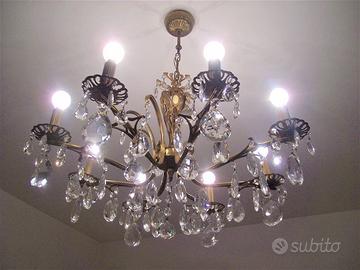 Lampadario 8 bracci in bronzo dorato ed ottone con pendenti di cristallo e portalampade in legno e gesso dorato, risalente alla prima metà del '900. Diametro 70 cm circa.