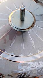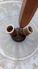 Antico lampadario con paralume in vetro serigrafato asta in legno,particolare e unico con due portalampade ancora in ceramica.Prezzo trattabile.Per gli altri annunci digitare SPQR in prov di Asti.