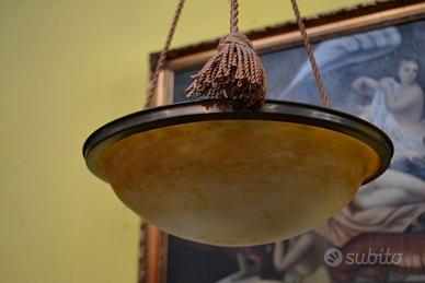Antico lampadario a sospensione francese stile Art Déco degli anni 40 circa, paralume in alabastro di colore giallo-ambrato, che diffonde una luce morbida e calda, montato su una struttura in ottone, sostenuta da tre corde decorate con nappe annodate dove si congiungono al corpo principale del lampadario, firma presente sul paralume