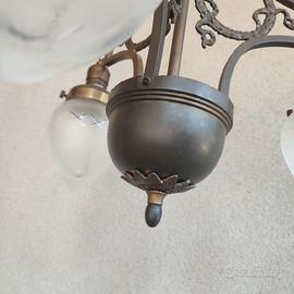Antico lampadario stile Impero, struttura in ottone con tre paralumi in vetro satinato e smerigliato, larghezza cm 45, altezza totale cm 85. No spedizione, solo ritiro a mano