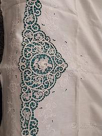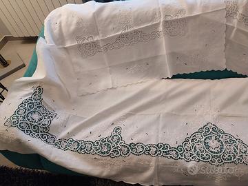 Si tratta di un antico lenzuolo con due federe interamente ricamato a mano risalente agli anni 60 ben tenuto e ben conservato e mai usato.