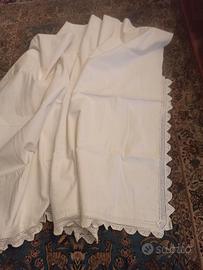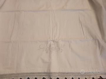 Lenzuolo sopra matrimoniale di pesante lino, con cifre ricamate e merletto, con due federe ricamate. Misura cm 230 x 260 , federe cm 79x64 (compreso merletto). Condizioni ottime. Spedizione tracciabile.