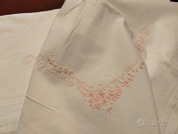 Antico lenzuolo matrimoniale, realizzato in puro cotone di un tempo e ricamato a mano (punto ombra e altri) con motivi floreali, nei toni del rosa tenue.
