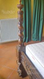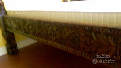 Antico letto thai, originale, provenienza Thailandia, secolo XIX , baldacchino, tutto teak, finemente intarsiato. Una piazza e mezzo. Quattro lati, quattro aste rimovibili per baldacchino Completo di rete per materasso. Misure 2,00m x 1,40m x 60cm