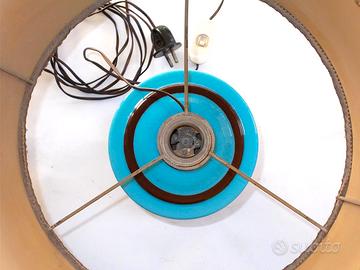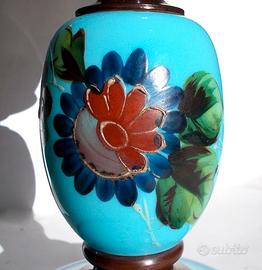 L’opaline è un vetro cui viene tolta trasparenza ma non lucentezza, così da farlo somigliare alla porcellana. Il procedimento della sua fabbricazione fu messo a punto in Francia all'inizio dell'Ottocento. L'impasto era reso lattiginoso con l'aggiunta di fosfato di calcio e ossido stannico, poi veniva colorato con ossidi di cobalto, rame, ferro oppure con polvere di carbone. Gli oggetti in opaline furono di gran moda durante il regno di Napoleone III e per tutta la seconda metà del secolo XIX. E' a questo periodo che risale il lume qui proposto. Lavorato con la tecnica della soffiatura a stampo, il manufatto è abbellito da decori floreali dipinti a mano. Nel secolo scorso è stato trasformato da lume a petrolio a lampada a illuminazione elettrica. Al posto del consueto paralume di vetro è stato messo un paralume di cartone pressato, rivestito di tela ornata con ricami. Dimensioni: 45 cm. di altezza e 28 cm. di diametro massimo. L'impianto elettrico è d'epoca ed è funzionante. La lampadina non è in dotazione.