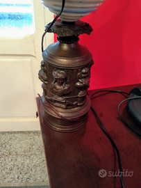 Lume del 1930 con base bronzea tutta lavorata, sull'intera rotondità del corpo risaltano figure in rilievo. Al centro il disco sferico in opale lavorato bianco con cerchio azzurro. L'arpa dove poggia l'abat-jour è in ottone brunito. Il lume è stato trasformato a lampada perfettamente funzionante. Il paralume presenta i segni del tempo sebbene la parte esterna è tuttora in buono stato.
