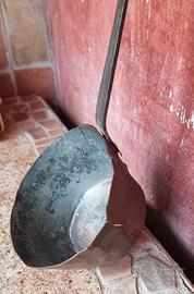 Il metallo appare fortemente affumicato e carbonizzato, a indicare il suo utilizzo vicino al fuoco. Questi mestoli venivano utilizzati nelle cucine di campagna per versare zuppa e acqua da grandi calderoni, così come nelle botteghe artigiane per la lavorazione di metallo fuso o resina, e talvolta in forni e fucine per la lavorazione di liquidi caldi.