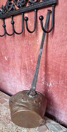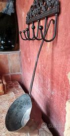 Antico mestolo italiano (mestolo), fatto a mano, in ferro battuto. Si tratta di un rarissimo utensile da cucina sopravvissuto, classificato come antico. A giudicare dalla forma e dal lungo manico, era un oggetto d'uso quotidiano dal XIX secolo all'inizio del XX secolo. Fu acquistato in Italia, in un villaggio di montagna, da una famiglia piemontese, che è riuscita a preservare un pezzo di storia fino ad oggi.