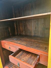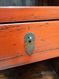 vendo stupendo mobile cinese antico, laccato rosso intenso, ideale come pezzo unico d'arredamento. Caratterizzato dalla tipica ferramenta circolare in ottone brunito centrale con chiusura Spillo e manile decorative, la struttura presenta un ampio vano centrale chiuso da 2 ante e 3 pratici, cassetti, inferiori, tutti definiti con pomelli in metallo, le gambe sono elegantemente sagomate, le finiture artigianali esaltano al fascino del pezzo. condizioni eccellenti perfetto per chi ama lo stile etnico o vintage