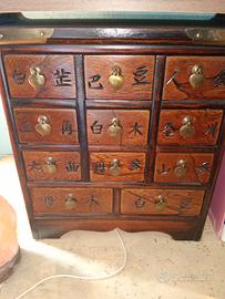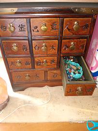 vendo antico mobile da farmacia cinese (usabile per qualsiasi cosa, io lo uso come portagioie) con 9 cassetti piccoli e 2 cassetti grandi, in perfetto stato. spedizione a carico dell' acquirente.