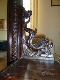 Antico mobile siciliano in legno intagliato, con specchiera, risalente al XIX secolo. E’ un mobile a due corpi, composto da una base completata da lastra di marmo e una parte superiore rialzata con specchiera e piccole vetrine laterali o ripiani. Realizzato in legno massello, noce, ciliegio io o quercia, data l'epoca e la robustezza.