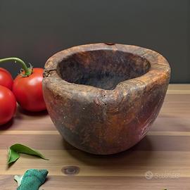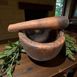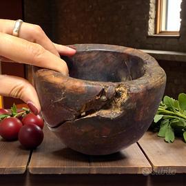 Mortaio con pestello. Provenienza: Aree alpine franco-italiane. Epoca: Fine XIX – inizi XX secolo. Materiale: Legno massiccio, trattato in epoca recente (cerato). Dimensioni: Diametro: 13 cm - Altezza ciotola: 10 cm - Lunghezza pestello: 17 cm. Condizioni: discrete; crepa antica e stabile, patina originale con trattamento successivo.