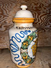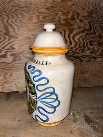 Raro orciolo di manifattura calatina, realizzato interamente a mano con motivi tipici della ceramica di Caltagirone. Proveniente da una farmacia del Messinese, conserva ancora parte dell’etichetta originale sotto smalto.