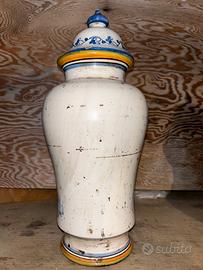 Raro orciolo di manifattura calatina, realizzato interamente a mano con motivi tipici della ceramica di Caltagirone. Proveniente da una farmacia del Messinese, conserva ancora parte dell’etichetta originale sotto smalto.