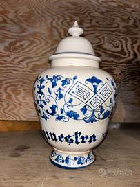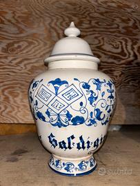 Eccezionale orciolo da farmacia in ceramica spessa, con decoro erboristico verde e blu, ispirato alle antiche botteghe dei speziali.