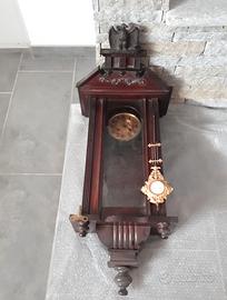 Antico orologio a pendolo, epoca primi del '900, con chiave di carica. Compreso nel prezzo fregio con aquila imperiale che volendo completa l'oggetto. Lievissima abrasione del legno frontale in basso. Dimensioni massime cm.80x40, fregio escluso. Consegna a mano Torino, in caso di spedizione si garantisce imballo professionale.