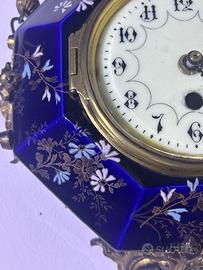 RAFFINATO OROLOGIO ANTICO IN CERAMICA SMALTATA BRILLANTE BLU COBALTO CON DECORAZIONI FLOREALI DIPINTE A MANO. INCORNICIATO DA CERAMICA INTEGRA. MECCANISMO ORIGINALE DA REGOLARE