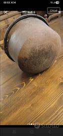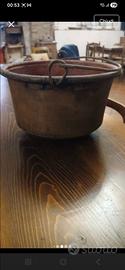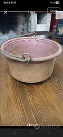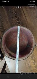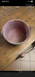 Paiolo antico in rame utilizzato storicamente per cucinare su fuoco aperto o come contenitore multiuso in contesti rurali. Questi oggetti sono oggi molto ricercati come pezzi d'arredamento vintage o rustico. Caratteristiche dell'oggetto Materiale: realizzato in rame con manici in ferro battuto. Utilizzo comune oggi: Spesso vengono riutilizzati come vasi per piante, contenitori per la legna da ardere accanto al camino o semplici elementi decorativi per agriturismi e case di campagna. Epoca: risale al XIX secolo. Dimensioni: diametro cm 30, altezza cm 20.