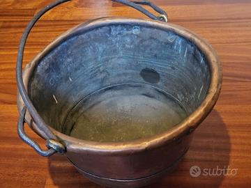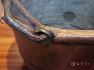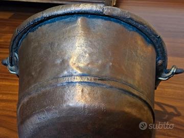 Vendesi splendido ed antico paiolo (teglia alta) in rame massiccio, ideale sia per uso culinario professionale che come prestigioso elemento d'arredo rustico o da collezione.