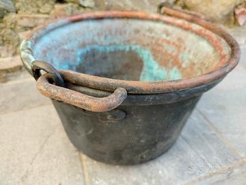 Antico paiolo in rame con manico, adatto ad un arredamento rustico. Diametro 28 cm, altezza (manico escluso) 18 cm. La pentola è visibile a Poggio a Caiano (Po). Spedizione disponibile con TuttoSubito.