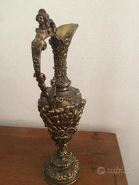 Piatto con brocca in bronzo del ‘900. Piatto dal bordo decorato con ghirlande a motivi vegetali divise da teste di putti. La tesa del piatto presenta un ricco decoro e le scene raffigurate da putti sono dentro riserve separate da quattro cariatidi. Nel cavetto il piattino ricorda lo stemma della famiglia Colleoni, importante casata bergamasca del '400. La brocca, talvolta ospitata nel cavetto del piatto, illustra scene con putti a tutto campo e presenta un'ansa con figura femminile.