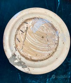 Il piatto presenta restauri visibili: una riparazione tradizionale con filo di ferro passante, realizzata secondo l’antica tecnica del “cuonza piatt’”. Sul retro, i punti metallici e il consolidamento in cemento testimoniano l’ingegno artigiano dell’epoca, quando ogni oggetto aveva una seconda vita.