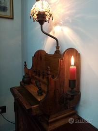 Porta lume in legno ed ottone antico con cassettino, braccio porta candela, porta penna, calamaio e luce a braccio orientabile con filo elettrico funzionante come da foto.