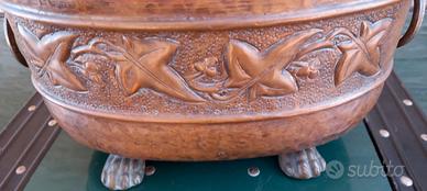 Complemento d'arredo per allestimenti ed esposizioni molto originale, splendido antico contenitore/porta vaso in rame sbalzato poggiante su quattro piedi leonini in ottone. È oblungo con le maniglie anch'esse in ottone. Mostra una bellissima patina del tempo.