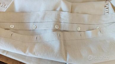 Antico ampio set per letto matrimoniale di nobile tessitura, dalla trama morbida e corposa, composto da due lenzuola, uno per sopra e uno per sotto con coppia di federe coordinate.