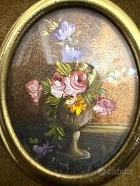 Antico quadretto in bronzo dorato e velluto contenente tre ovali con dipinti ad olio. In ottime condizioni nonostante l’età