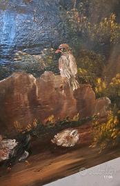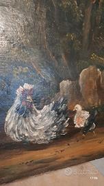 Splendido antico quadro dipinto olio su tavola cm 53x28 raffigurante paesaggio campestre con galline e uccelli. la tavola è spessa e molto pesante reca lievi segni del tempo splendido da collezione