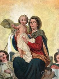 Antico dipinto ad olio su tela di fine 800 inizi 900, madonna con bambino dí eccellente fattura, colori vividi e luminosi. Recentemente restaurato. Misura 98 x 76 cm.