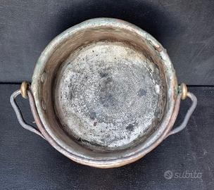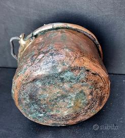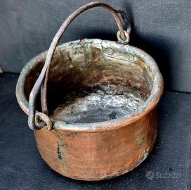 Cond:è molto usurata,il metallo è lacerato in alcuni punti e la sua patina verde naturale è intatta.Non si tratta di un difetto: questi segni di fuoco, acqua e tempo sono particolarmente preziosi per collezionisti e antiquari.Solo gli utensili da cucina antichi autentici possono presentare questo livello di deterioramento naturale,che ne sottolinea l'età e permette di entrare in contatto con la storia degli utensili da cucina dei nostri antenati.