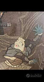Eccezionale pannello ricamato giapponese, raffigurante una scena di battaglia tra guerrieri samurai, realizzato interamente a mano su tessuto di seta con filati policromi e inserti metallici.