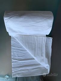 Rotolo di stoffa fatto in cotone per vari usi. Mai utilizzato, srotolato solo per prendere le misure. I primi 50 cm presentano macchie del tempo che si tolgono lavandolo. Presumo sia stato fatto al telaio. Adatto per utilizzi vintage. Le misure sono: 7 metri e 70 cm di lunghezza X 56 cm di larghezza. Peso 980 grammi. Stoffa abbastanza pesante tipo lavorata.