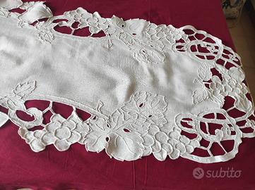 Runner in puro lino corposo lavorato e ricamato ad intaglio e punto cordoncino. Frutta e fiori riprodotti con cura,b tutto a mano. 168 x 46 cm. Vendo 100 euro.
