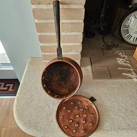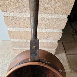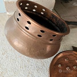 Vendo splendido braciere a mano (scaldino) d'epoca in rame massiccio martellato a mano, completo di coperchio traforato originale e manico in ferro battuto.L'oggetto è un pezzo autentico di antiquariato rurale, perfetto come elemento d'arredo per casali, taverne o per amanti del genere industrial/vintage. Peso: 1,48 kg. Circonferenza corpo 71 cm Diametro coperchio 22 cm. h 14 cm. Lunghezza manico 26 cm. Ritiro in loco