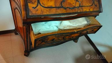 Vendo elegante scrittoio d’epoca in legno massello, risalente alla fine del XIX secolo, con alzata superiore dotata di doppio specchio e frontone sagomato. Il mobile presenta una ribalta apribile che cela vani e cassetti interni, ideale come piano di scrittura o lavoro. La parte inferiore è composta da ampi cassetti con maniglie originali e intagli decorativi.
