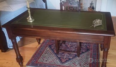 Scrivania risalente agli inizi del XX secolo restaurata e rifinita a cera per conservare la patina originale. Legno di mogano, di ottima qualità e robustezza. Presenta un piano in pelle verde decorato a mitra (fregi oro), un sottopiano con due cassetti rivestiti internamente, gambe tornite. Lunga 150 cm, profonda 78 cm, alta 80 cm.