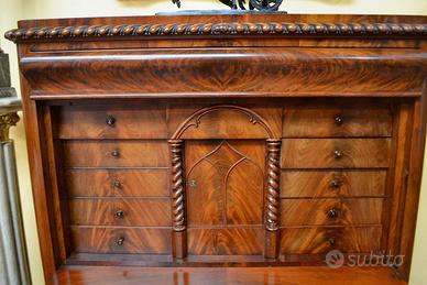 Piano superiore ornato da una modanatura a cordone con cassetto sottopiano , piano centrale centrale a ribalta dove all’interno si cela un meraviglioso scarabattolo provvisto di un cassetto centrale e otto cassetti , sportello centrale con chiave e colonne tornite a spirale, ampio piano di scrittura , tre ampi cassetti nella parte inferiore con chiavi funzionanti.