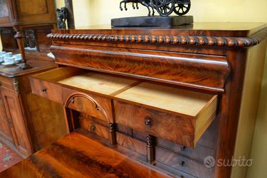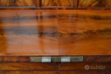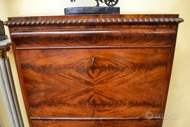 Elegante secretaire a ribalta stile Biedermeier degli inizi del 900, caratterizzato da un eccezionale piuma di mogano fiammato .