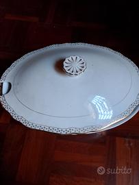 Servizio di piatti antico e raro marchiato S.C. Richard - S Cristoforo che indica la produzione nell' 800 presso la fabbrica di S Cristoforo attiva prima della fusione con la manifattura Ginori avvenuta nel 1896.I bordi sono ondulati con decoro in jstelline dorate e filettatura in oro. È composto da: Zuppiera lunghezza cm 35- larghezza cm 23. Piatto grande rotondo diametro cm 29- Insalatiera rotonda diametro cm 24 Altezza 9,5 cm - 4 piatti piani diametro cm 24 - 6 piatti fondi diametro cm 23- 6 piattini diametro cm 19. L' insalatiera ha il decoro in parte sbiadito.