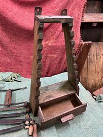 ANTICO SUPPORTO CON CASSETTO IN LEGNO VERNICIATO , PARTICOLARE FORMA PIRAMIDALE , IN OTTIMO STATO DI CONSERVAZIONE , ORIGINALE DEI PRIMI ANNI DEL 1900 , PRESENTA DELLE PIASTRE IN FERRO PER APPENDERLO , REALIZZATO PER CONTENERE ANTICHI ATTREZZI PER LA LAVORAZIONE DEL LEGNO , NELLO SPECIFICO SONO SCALPELLI ORIZZONTALI PER MASTRI CARPENTIERI , COMPLETO DI SET DI ATTREZZI DI VARIE MISURE , IN TOTALE SONO 8 , OGGETTO RARO E PARTICOLARE , OGGETTO DA COLLEZIONE . LE MISURE SONO :