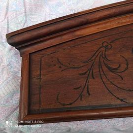 bellissimo sopraporta del '900 in legno di abete tinto noce, restaurato. intagliato a mano. con semplice aggiunta di pomelli, utilizzabile come attaccapanni. dimensioni in cm: lunghezza inferiore 125, lunghezza superiore 130; altezza minima 22, massima 33; profondità minima 3, massima 6. preferibile ritiro a mano.