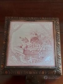 bellissimo sottopentola francese antico anni 20, in legno intarsiato e ceramica, misure 29x 29
