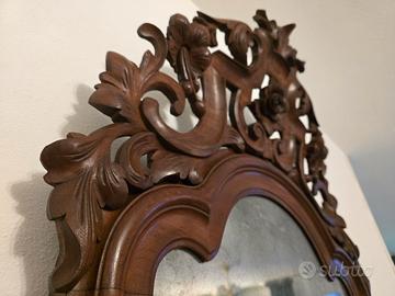Intagliato a mano, cornice in legno massello, il vetro dello specchio specchio è originale e presenta la tipica ossidazione data dal tempo.
