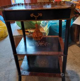 Bellissimo tavolino etagere francese stile Napoleone III, seconda metà XIX secolo. In legno, varie essenze, con intarsi floreali sui tre ripiani e filettato. Ringhierina in ottone e cassetto estraibile. Non necessita di restauro. Consegna sul posto anche al corriere, con spese a carico dell'acquirente. Il costo della spedizione è indicativo.
