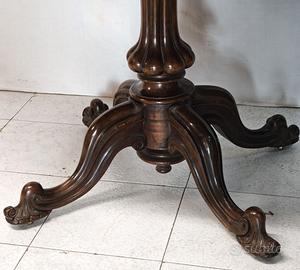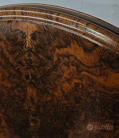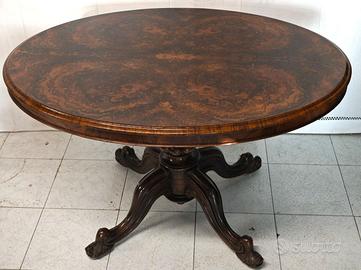 Tavolo a vela inglese d’epoca Vittoriana, databile alla metà del XIX secolo, realizzato in legno di noce massello con piano ovale impiallacciato in radica di noce, presentando venature profonde e specchiate di grande impatto estetico. Il tavolo è dotato di meccanismo a vela coevo e perfettamente funzionante, che consente di ribaltare il piano in posizione verticale quando non in uso. Il fusto centrale tornito poggia su 3 piedi sagomati, conferendo stabilità ed eleganza all’insieme. ✔️ Ottime condizioni, presenti lievi graffi sul piano visibili in foto. 📏 Dimensioni • Altezza: 74 cm • Piano: 90 x 145 cm • Altezza aperto a vela: 150 cm ✅ Ritiro a mano zona Salerno ✅ Spedizione in tutta italia da concordare Mercatino dell'antiquariato Tiriciclo , Salerno