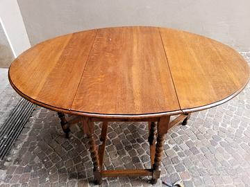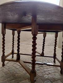 Elegante tavolo consolle antico in stile inglese, con piano allungabile grazie a due alette laterali (bandelle), che da chiuso occupa poco spazio e da aperto assume una forma ovale.