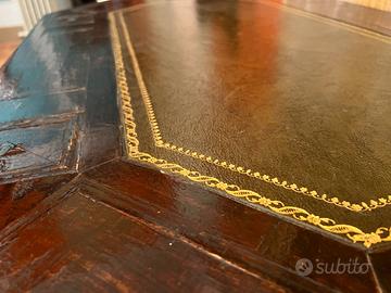 Antico tavolo da gioco/scrittoio in noce, di piccole dimensioni, stile Barocco. piano esagonale parzialmente rivestito in pelle di colore verde, cinque gambe d'appoggio intagliate a piuma e parzialmente dorate